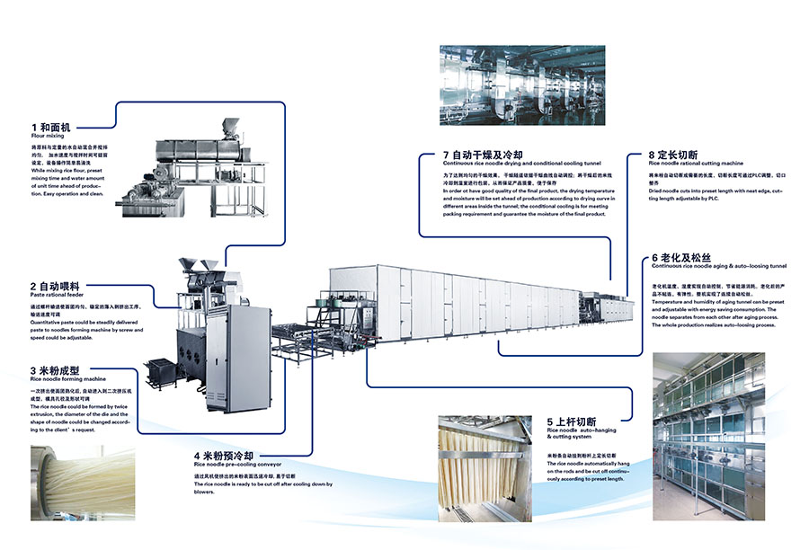 該生產(chǎn)線(xiàn)可用于生產(chǎn)江西米粉、桂林米粉等直條米粉用,產(chǎn)品直徑從1.0mm1.6mm可調,生產(chǎn)出的直條米粉質(zhì)地緊密、外形均勻、條型整齊、口感滑爽Q彈,可煮可炒。生產(chǎn)線(xiàn)設計科學(xué)、工藝合理、操作簡(jiǎn)單、使用人工少、故障率低、自動(dòng)化程度高,可實(shí)現生產(chǎn)過(guò)程標準化。除可生產(chǎn)普通米線(xiàn)外,本生產(chǎn)線(xiàn)還可用于紅米、黑米等其他復配原料的生產(chǎn),為廣大消費者提供更多的選擇。